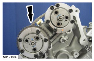 The timing mark on the exhaust VCT assembly should be in the 11 o'clock position.