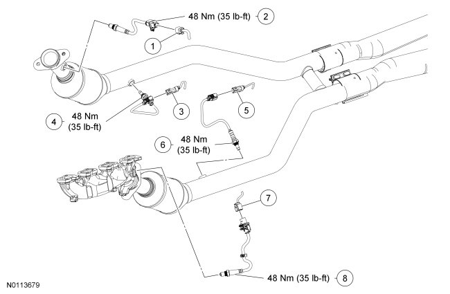 NOTE: The correct torque wrench setting must be calculated when using the Exhaust Gas Oxygen Sensor Socket to install the HO2S and/or CMS.