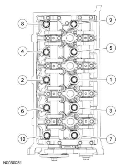 Install the bearing cap bolts and tighten in the sequence shown to 10 Nm (89 lb-in).