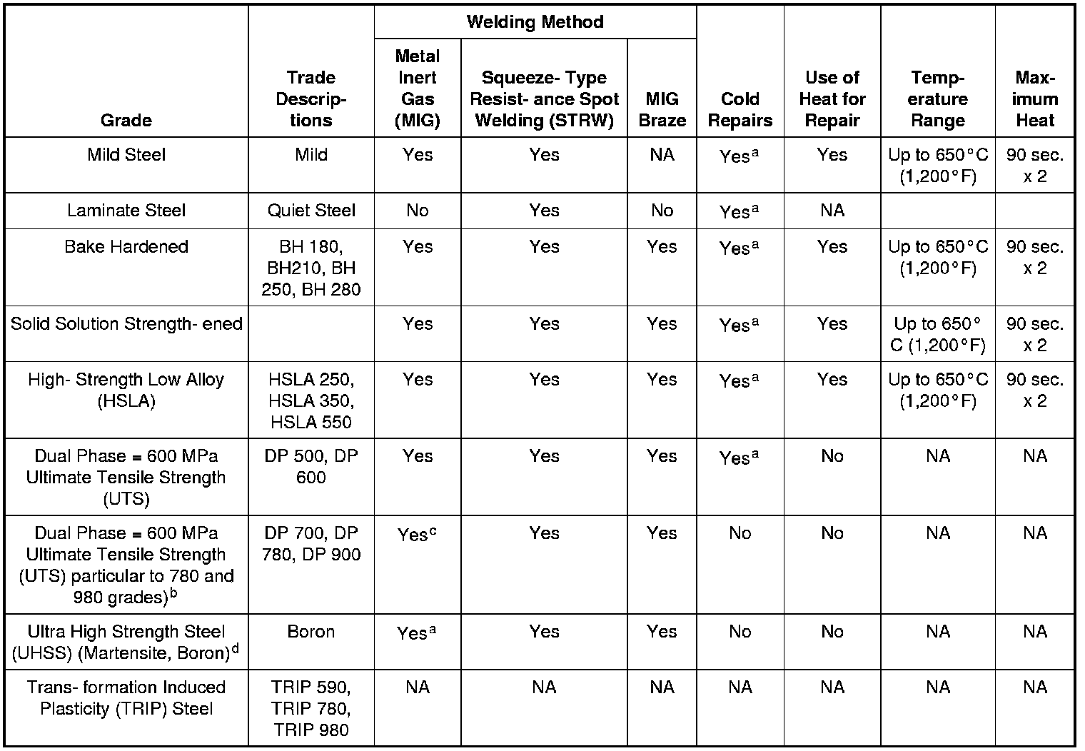 b Dual phase steels DP 700, DP 780 and DP 980 must be replaced at factory joints, no sectioning unless approved procedure in information