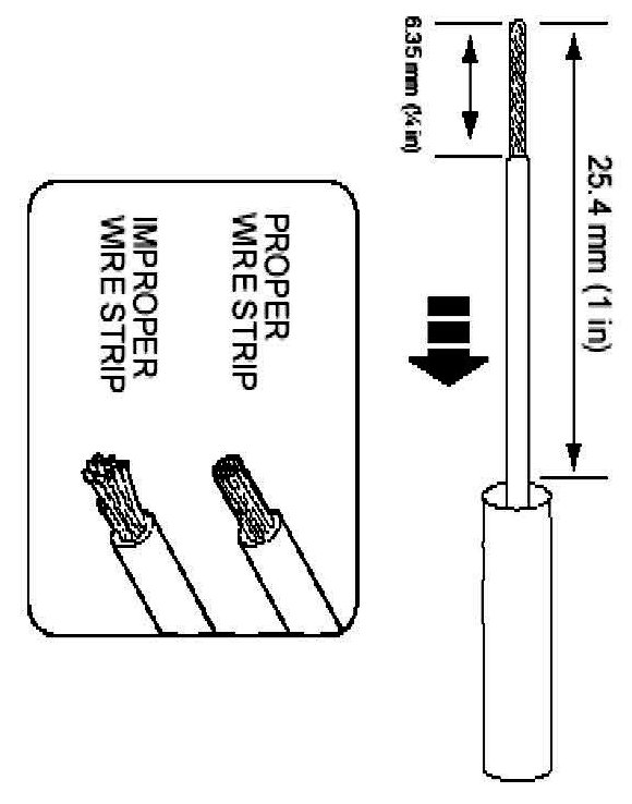 2. Strip 6.35mm (1/4 in) of insulation from each wire end, taking care not to nick or cut wire strands.