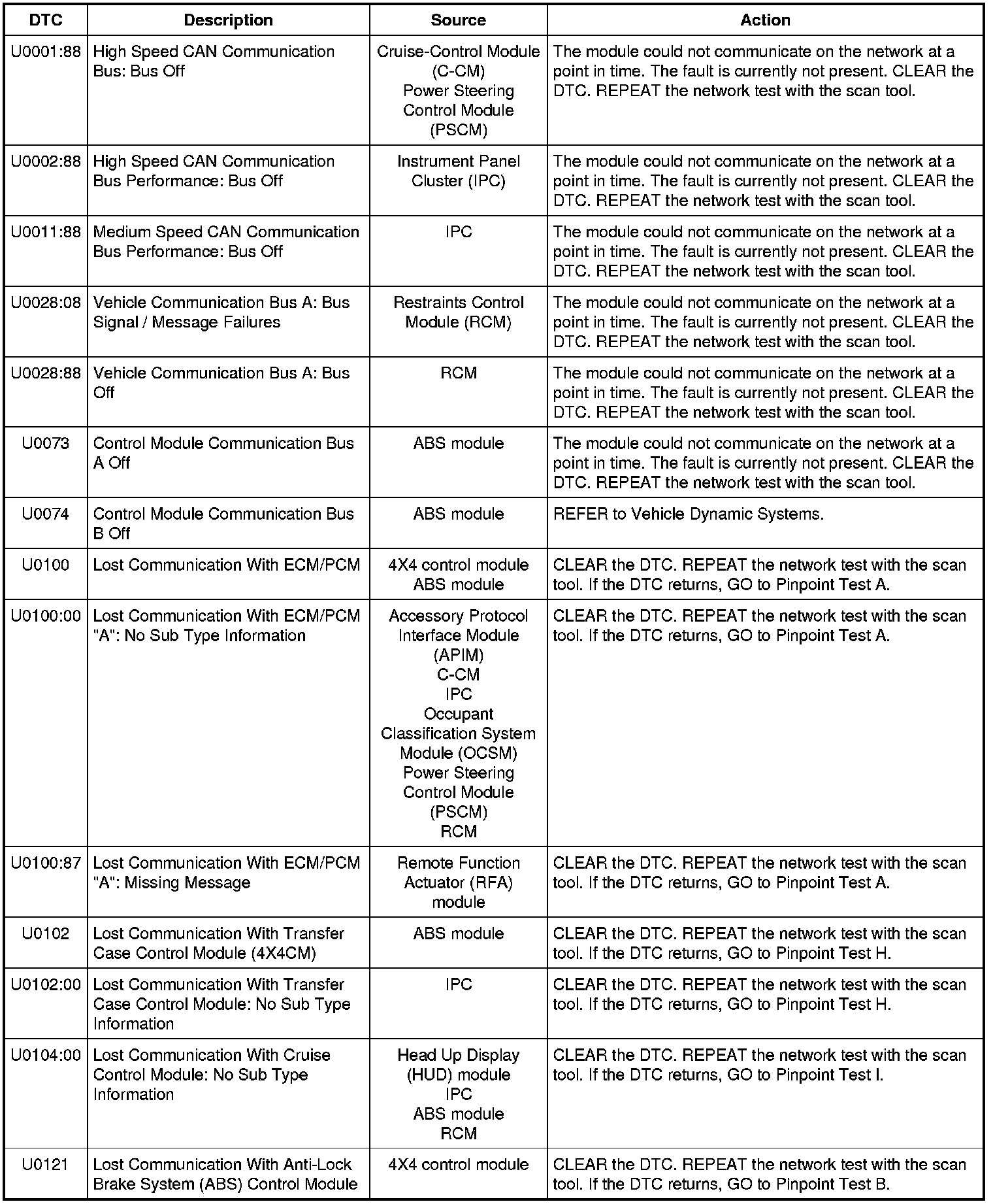 NOTE: Network DTCs (U-codes) are often a result of intermittent concerns such as damaged wiring or low battery voltage occurrences. Additionally, vehicle repair procedures such as module reprogramming often sets network DTCs. Replacing a module to resolve a network DTC is unlikely to resolve the concern. To prevent repeat network DTC concerns, inspect all network wiring, especially connectors. Test the vehicle battery, refer to Battery, Mounting and Cables Testing and Inspection.