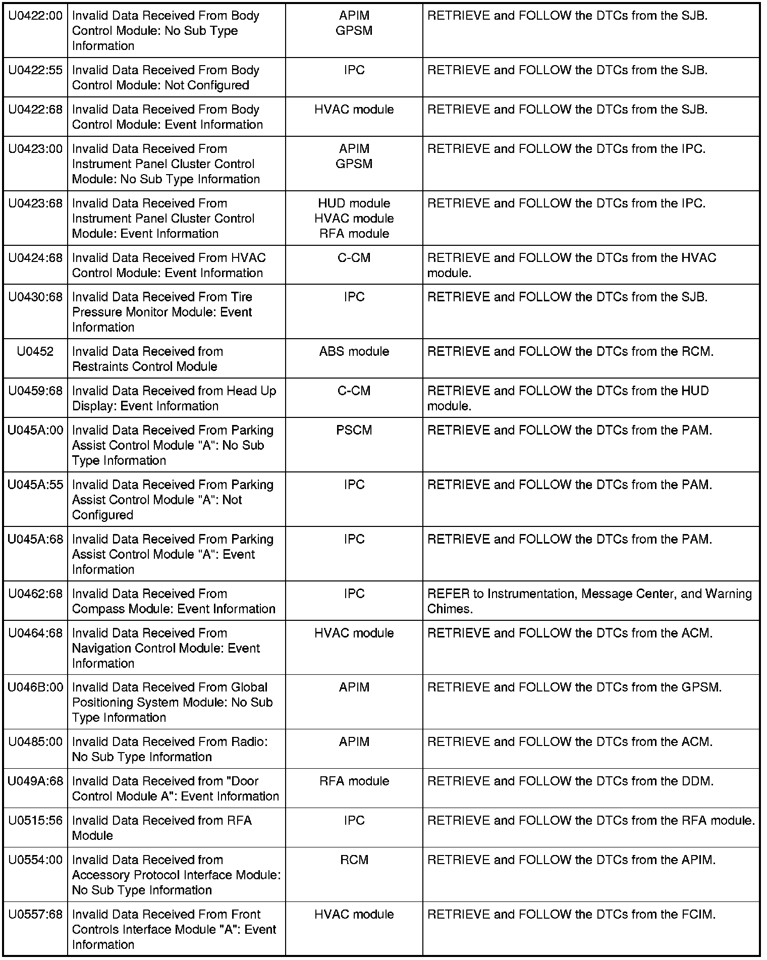 NOTE: This module utilizes a 5-character DTC followed by a 2-character failure-type code. The failure-type code provides information about specific fault conditions such as opens, or shorts to ground. Continuous memory DTCs have an additional 2-character DTC status code suffix to assist in determining DTC history.