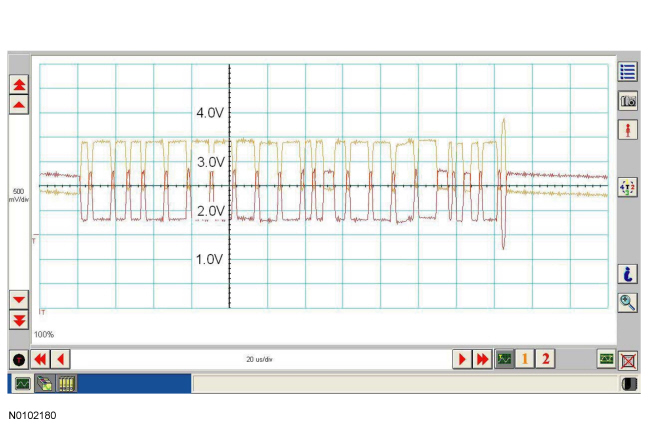NOTE: The oscilloscope traces below are from the Integrated Diagnostic System (IDS) oscilloscope taken using the IDS pre-configured CAN settings. The traces are for both data (+) and data (-) taken simultaneously (2-channel) at a sample rate of 1 mega-sample per second (1MS/s) or greater.