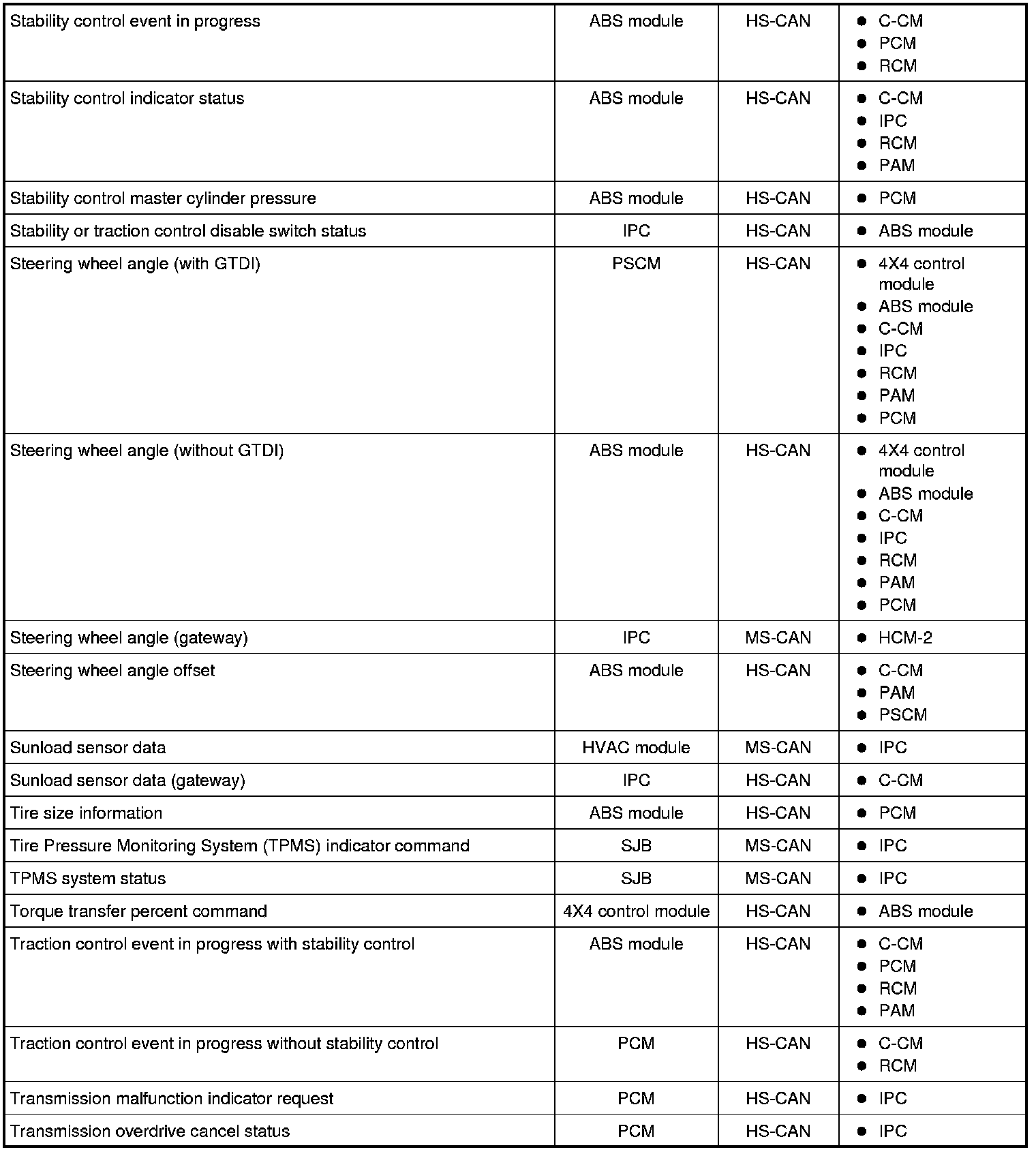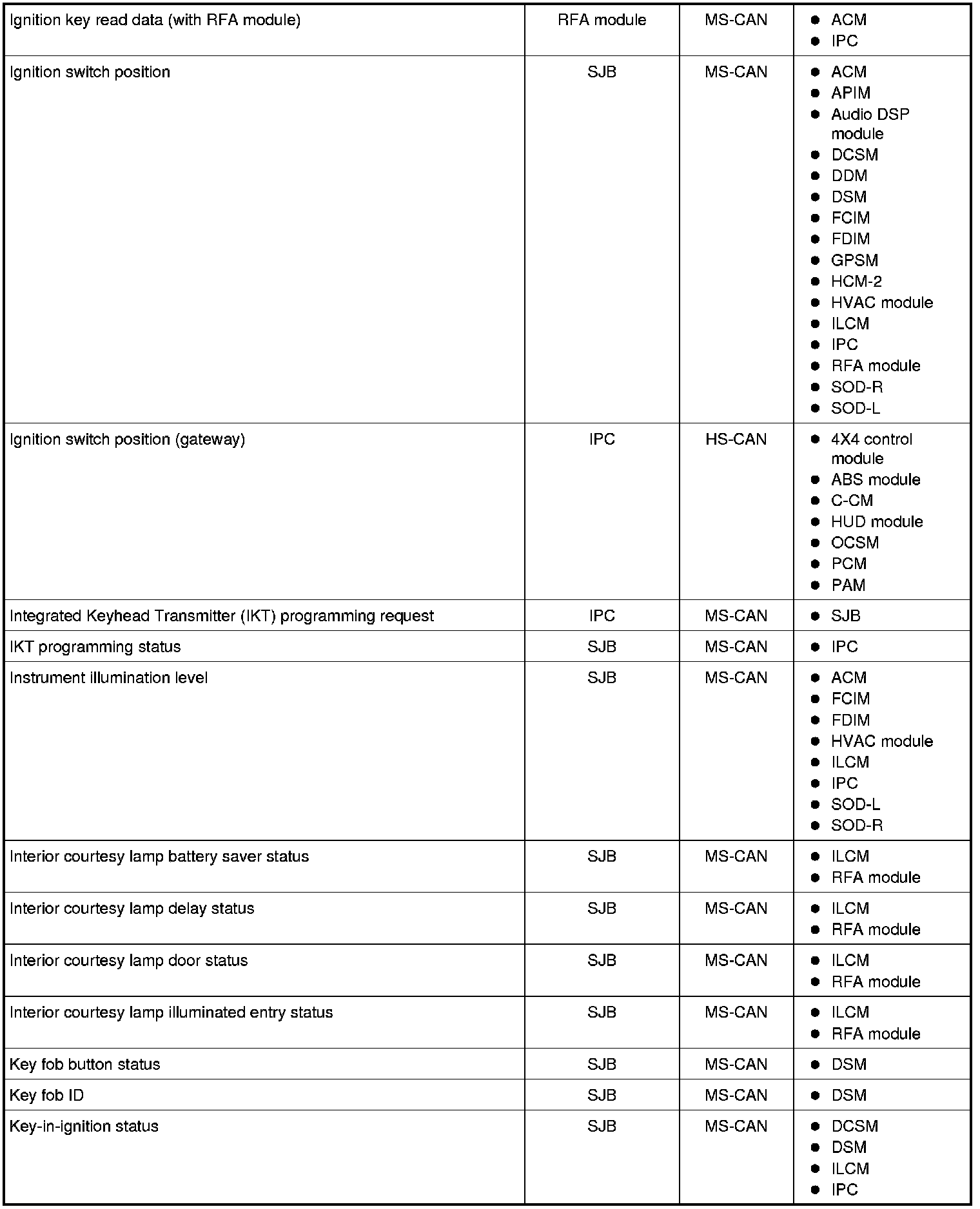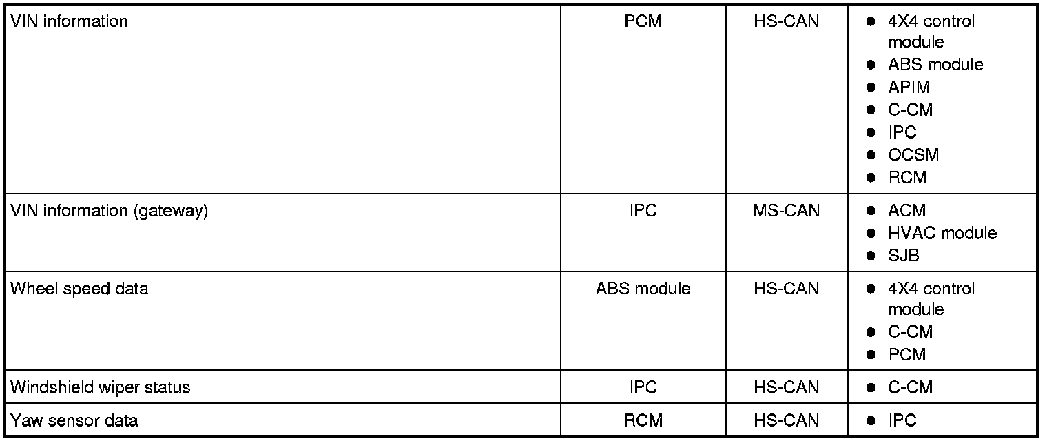 NOTE: This chart describes the specific HS-CAN and MS-CAN messages broadcast by each module, and the module(s) that receive the message.