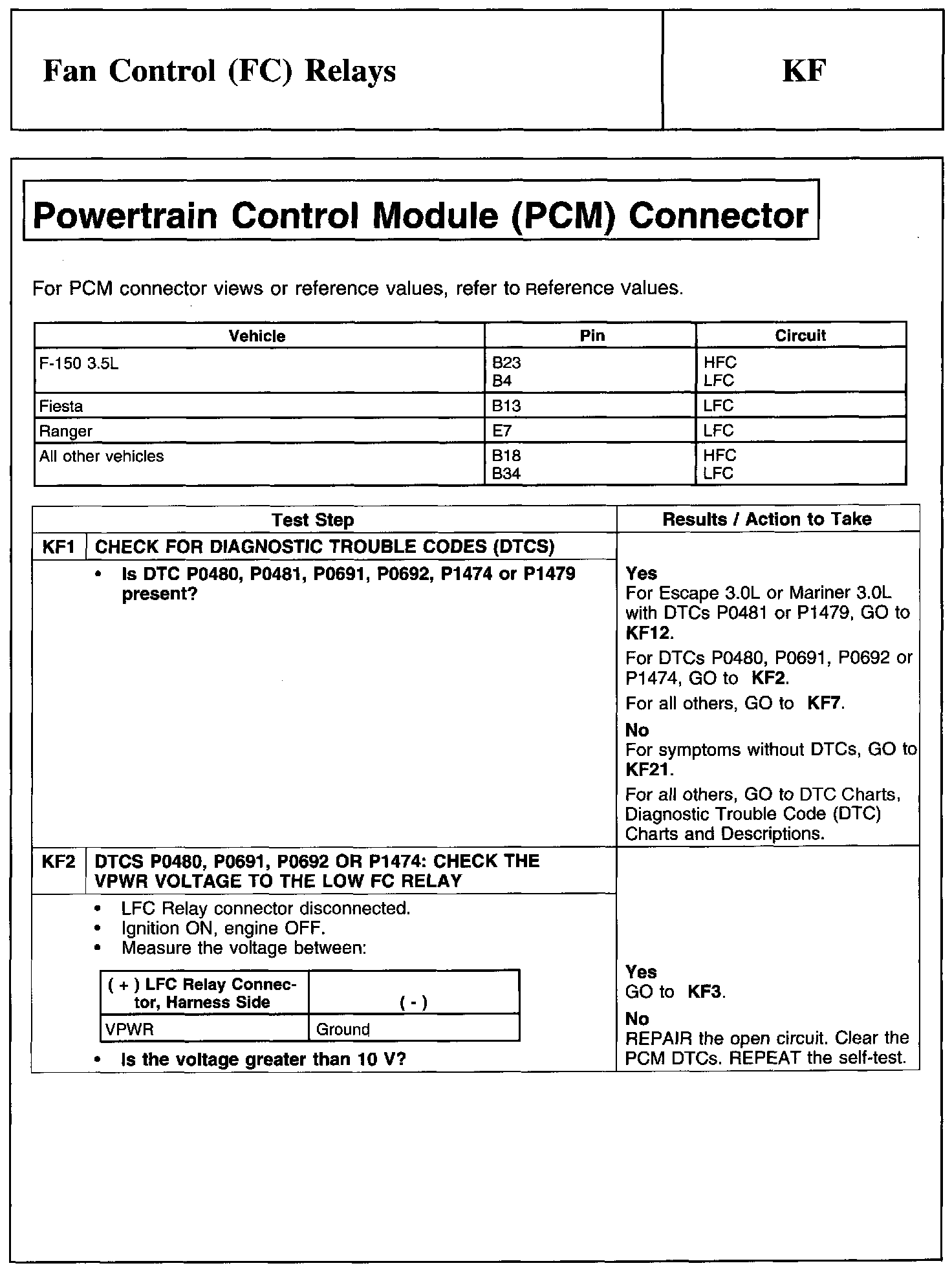 Home >> Ford >> 2011 >> Taurus AWD V6-3.5L >> Repair and Diagnosis >> Powertrain Management >> Computers and Control Systems >> Testing and Inspection >> Pinpoint Tests >> Test KF: Fan Control (FC) Relays