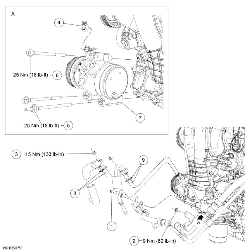 7. Remove the A/C compressor suction and discharge fitting nuts and disconnect the fittings.