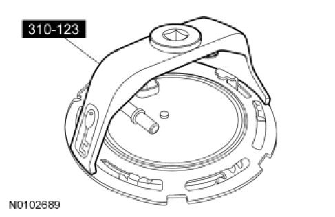 3. NOTICE: Carefully install the Fuel Tank Sender Unit Wrench to avoid damaging the Fuel Pump (FP) module when removing the lock ring.