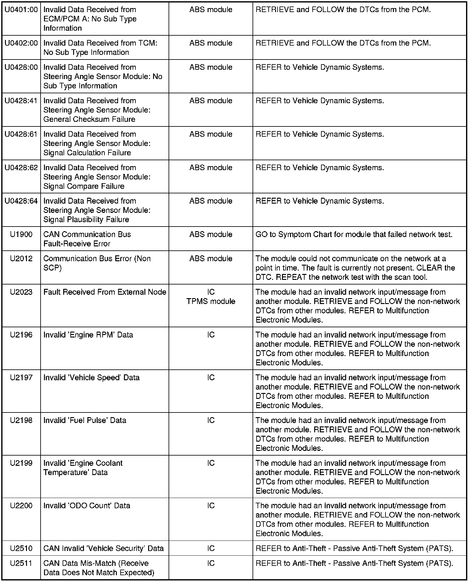 NOTE: Network DTCs (U-codes) are often a result of intermittent concerns such as damaged wiring or low battery voltage occurrences. Additionally, vehicle repair procedures such as module reprogramming often set network DTCs. Replacing a module to resolve a network DTC is unlikely to resolve the concern. To prevent repeat network DTC concerns, inspect all network wiring, especially connectors. Test the vehicle battery, refer to Battery, Mounting and Cables Testing and Inspection.