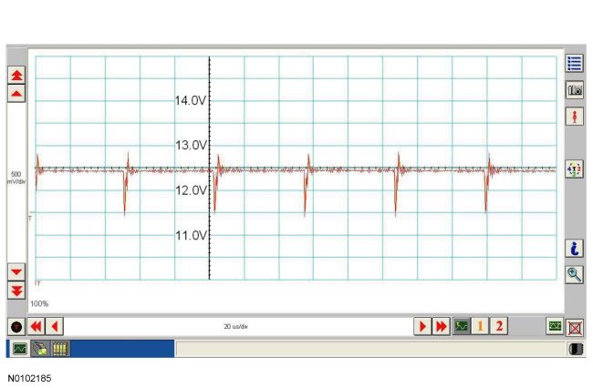 NOTE: The oscilloscope traces below are from the Integrated Diagnostic System (IDS) oscilloscope taken using the IDS pre-configured CAN settings. The traces are for both data (+) and data (-) taken simultaneously (2-channel) at a sample rate of 1 mega-sample per second (1MS/s) or greater. Traces below are viewed at 500mV per division (vertical axis) and 20 microseconds (20�s) per division (horizontal axis). Readings taken with a different oscilloscope vary from those shown. Compare any suspect readings to a known good vehicle.