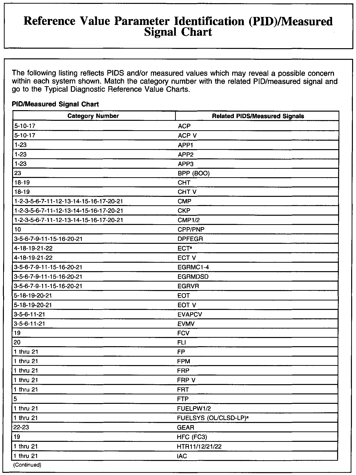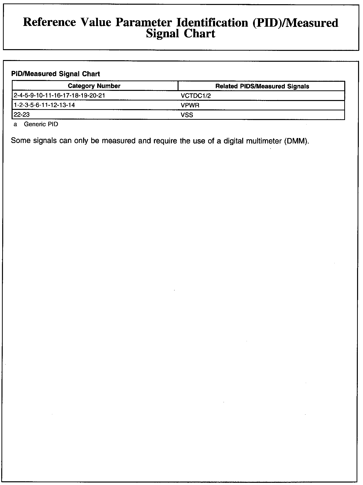 REFERENCE VALUE PARAMETER IDENTIFICATION (PID)/MEASURED SIGNAL CHART