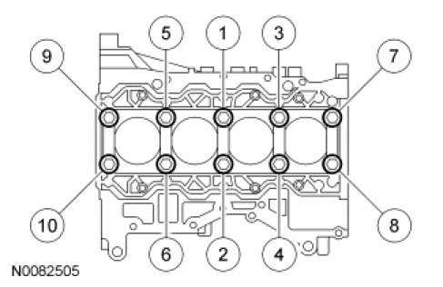 Using the original main bearing beam bolts, install and tighten the 10 main bearing beam bolts.