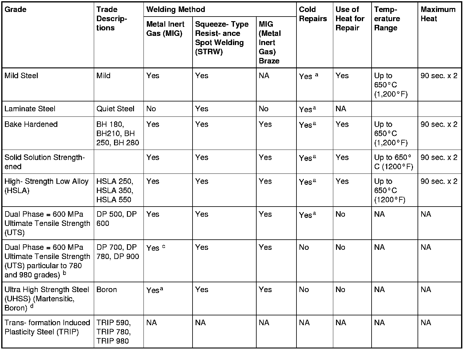 b Dual phase steels DP 700, DP 780 and DP 980 must be replaced at factory joints, no sectioning unless approved procedure in diagnostic/repair information
