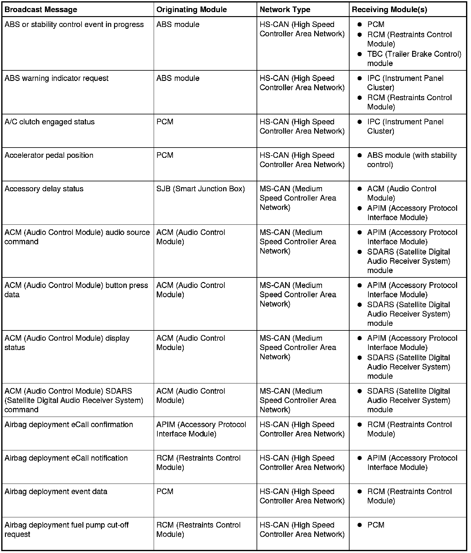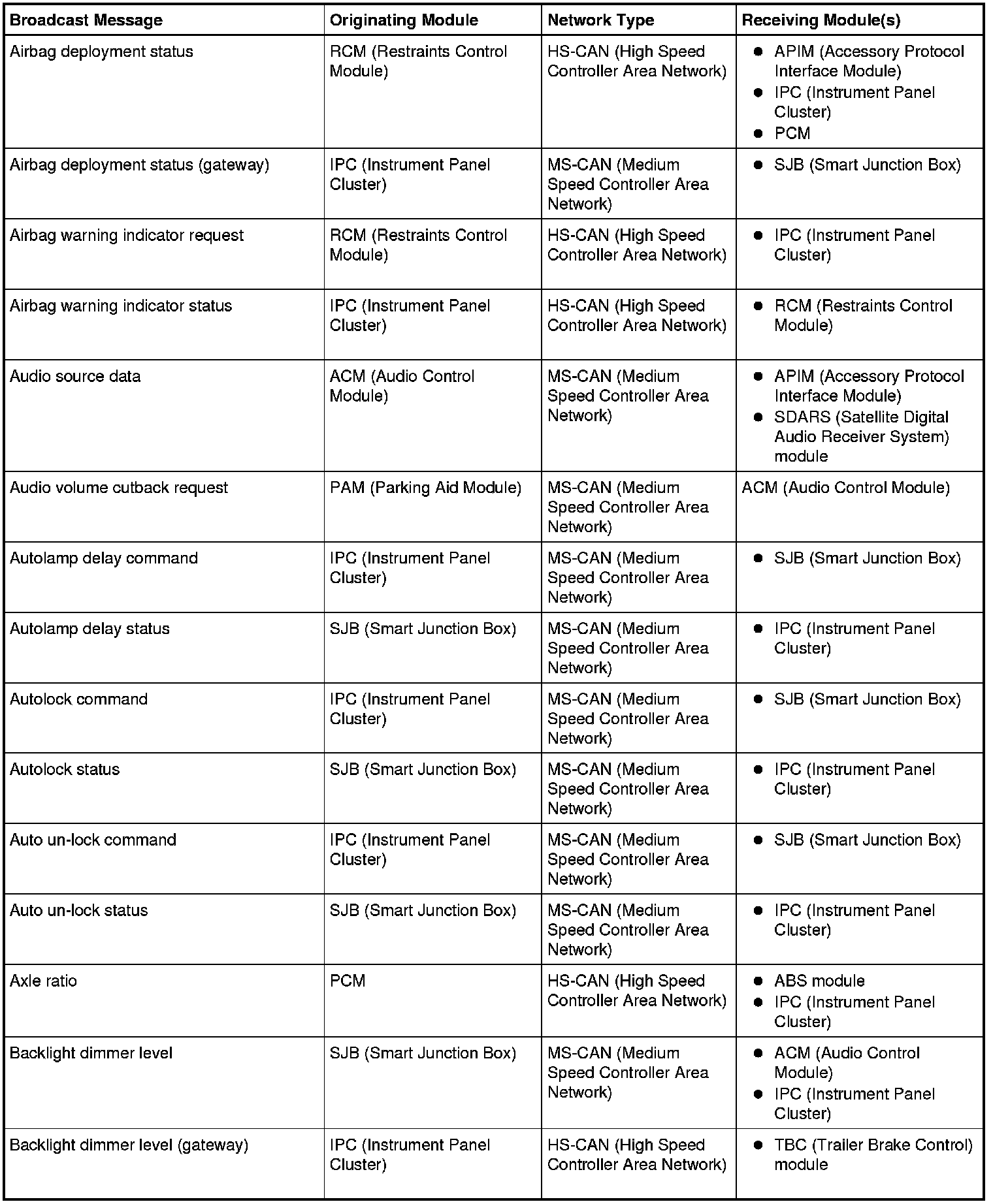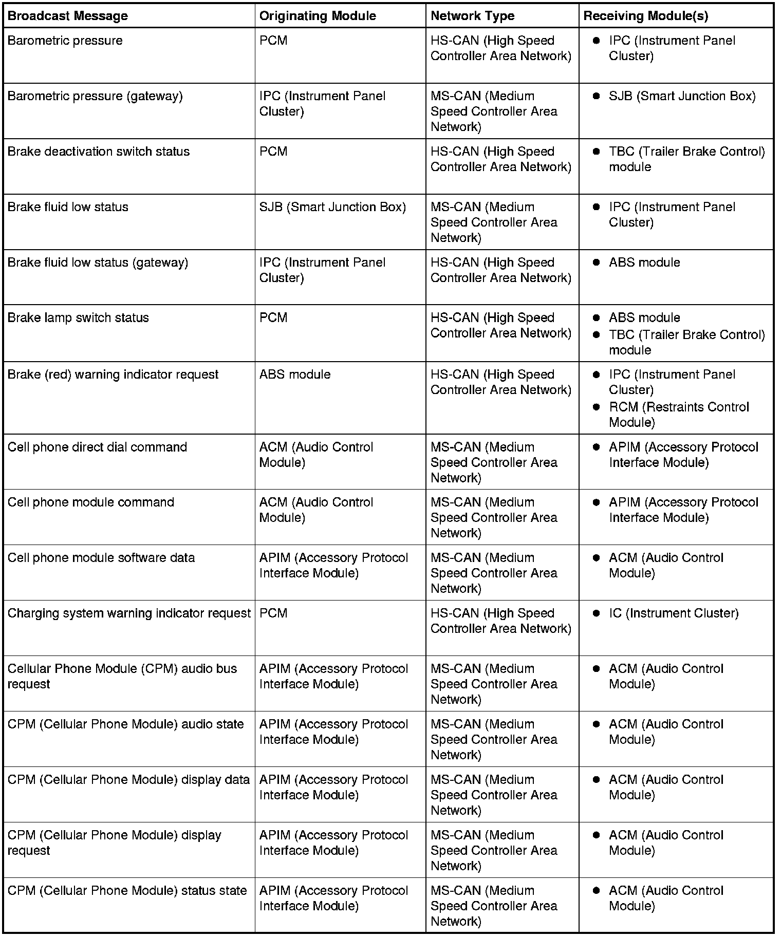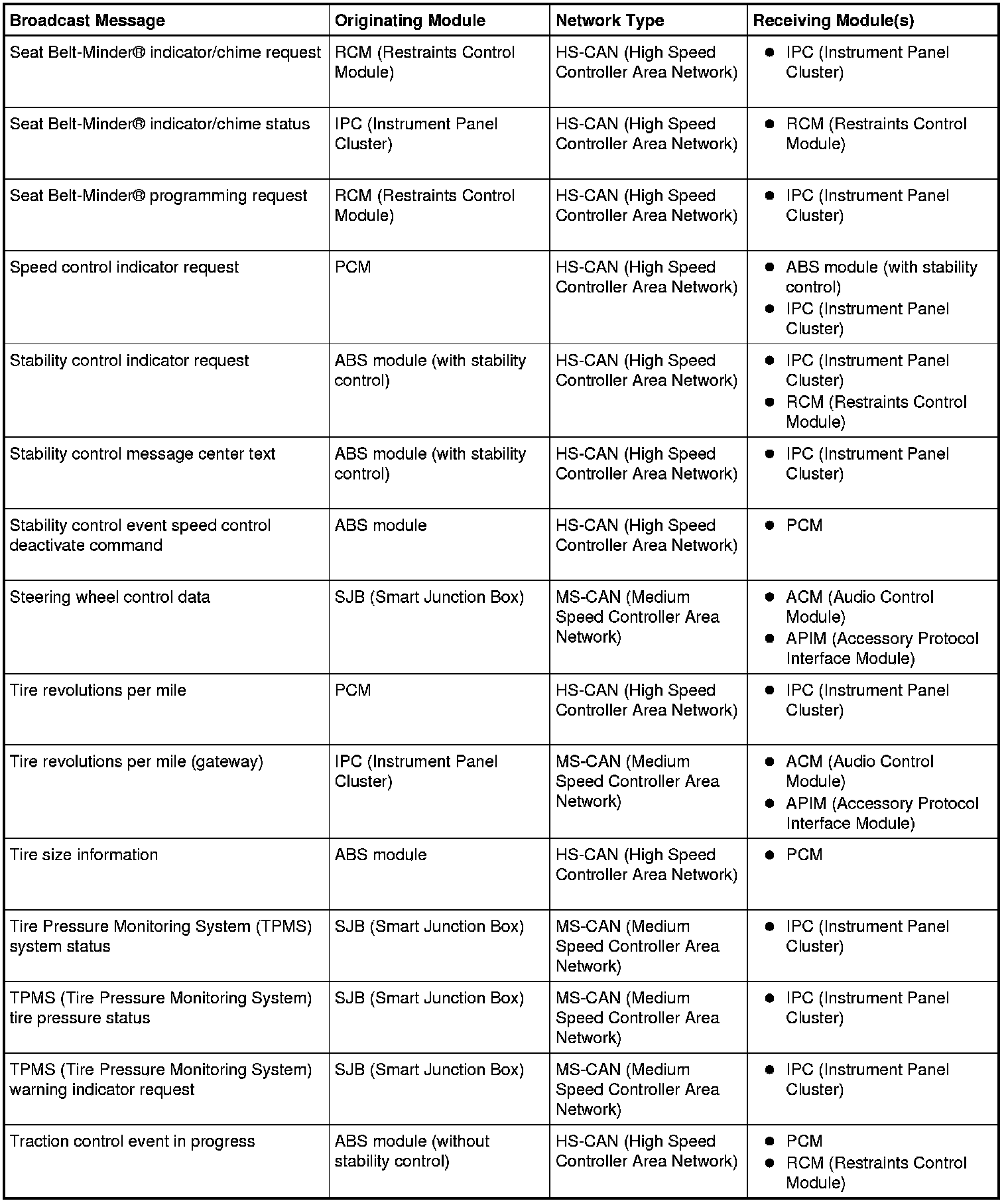 Modules on the CAN (Controller Area Network) utilize simultaneous communication of two or more messages on the same network circuits. The following chart summarizes the messages sent and received on the network.
