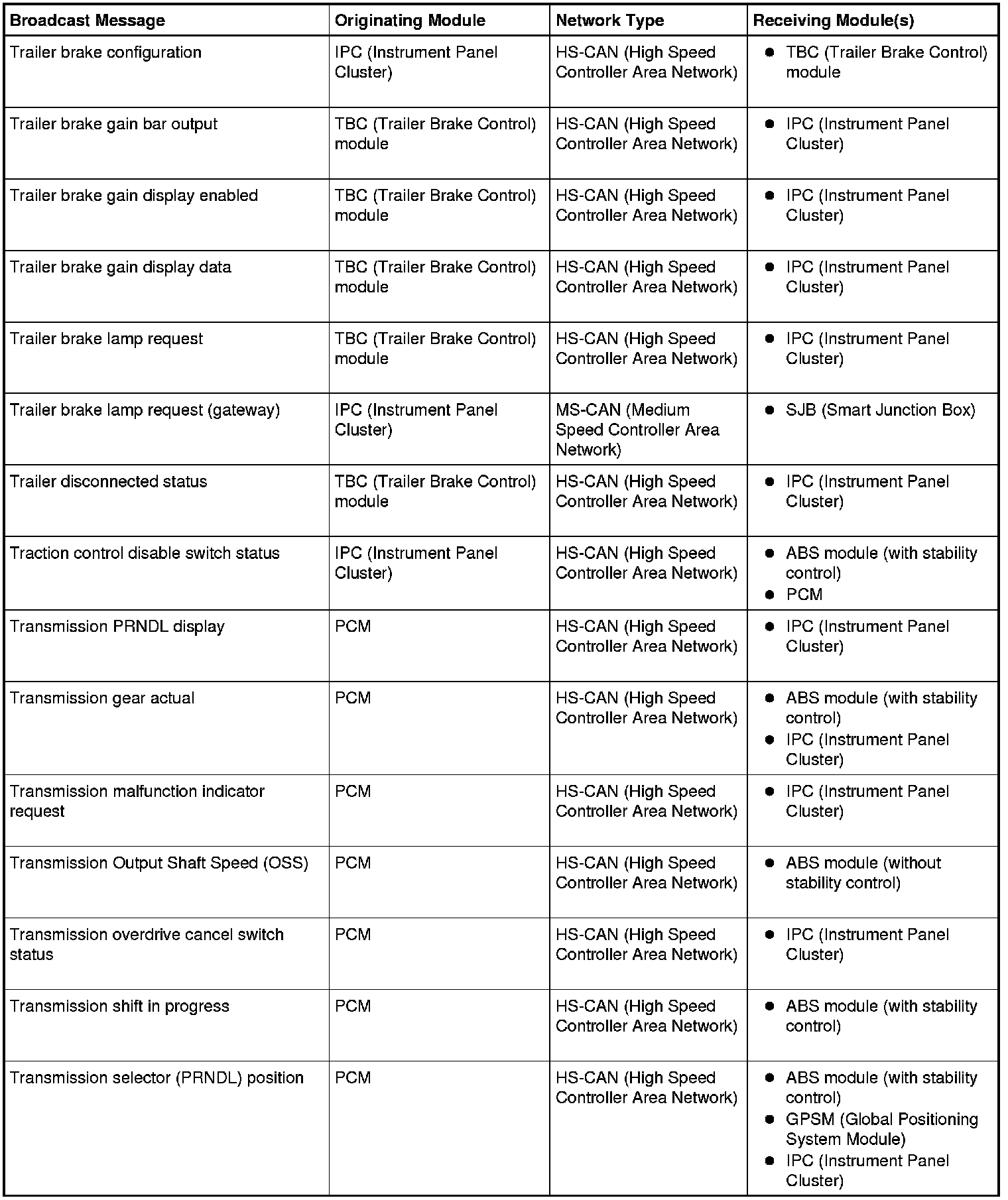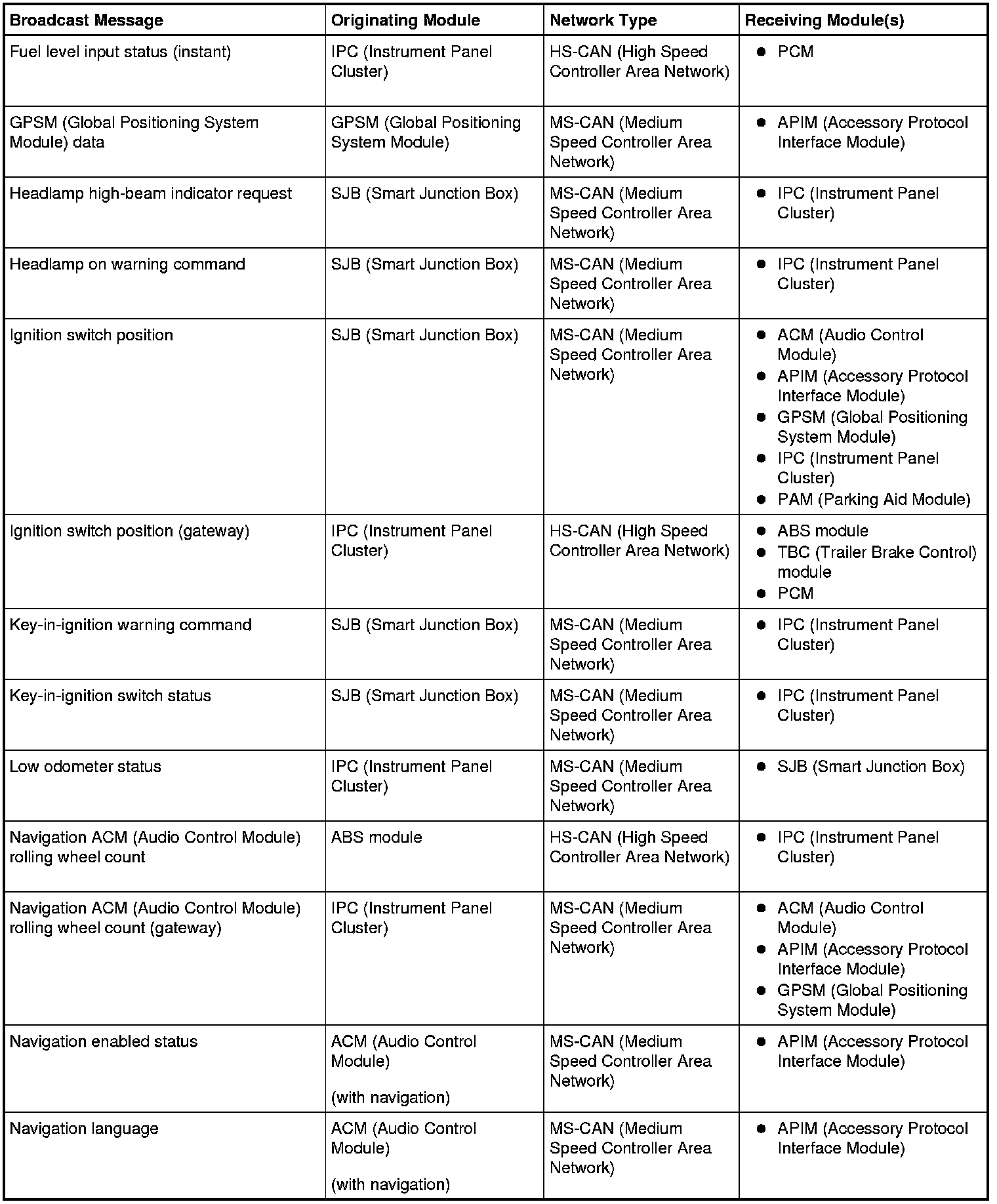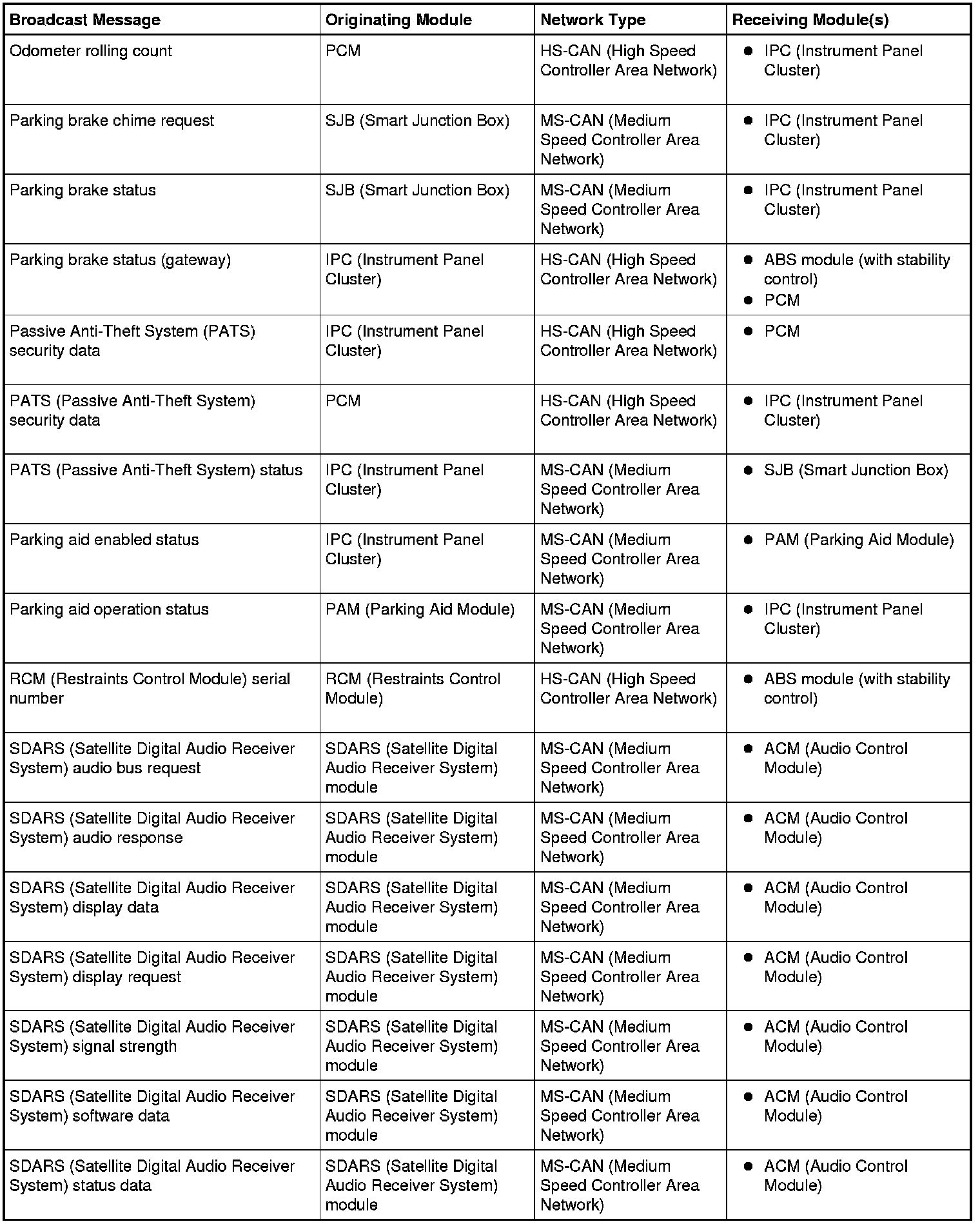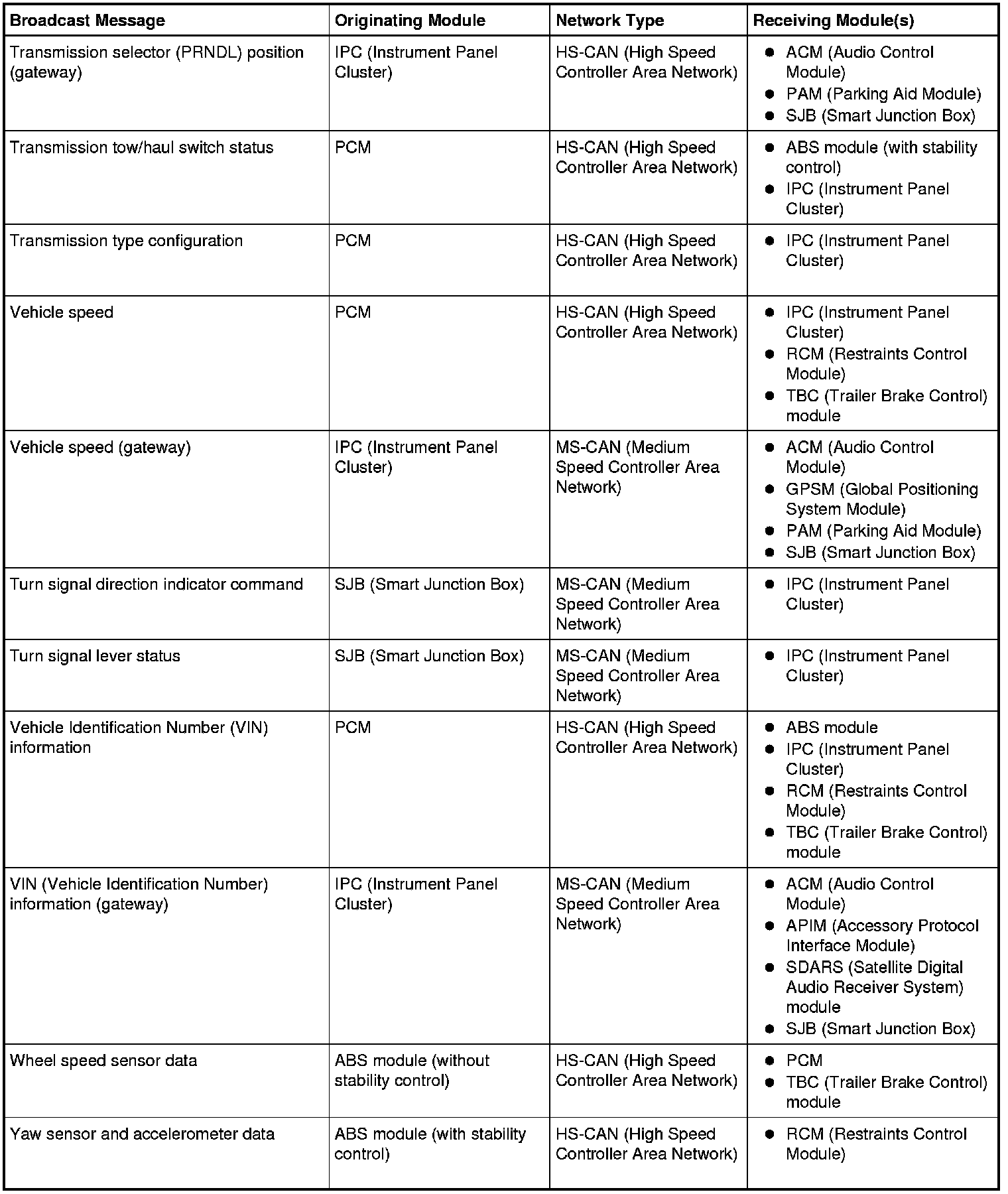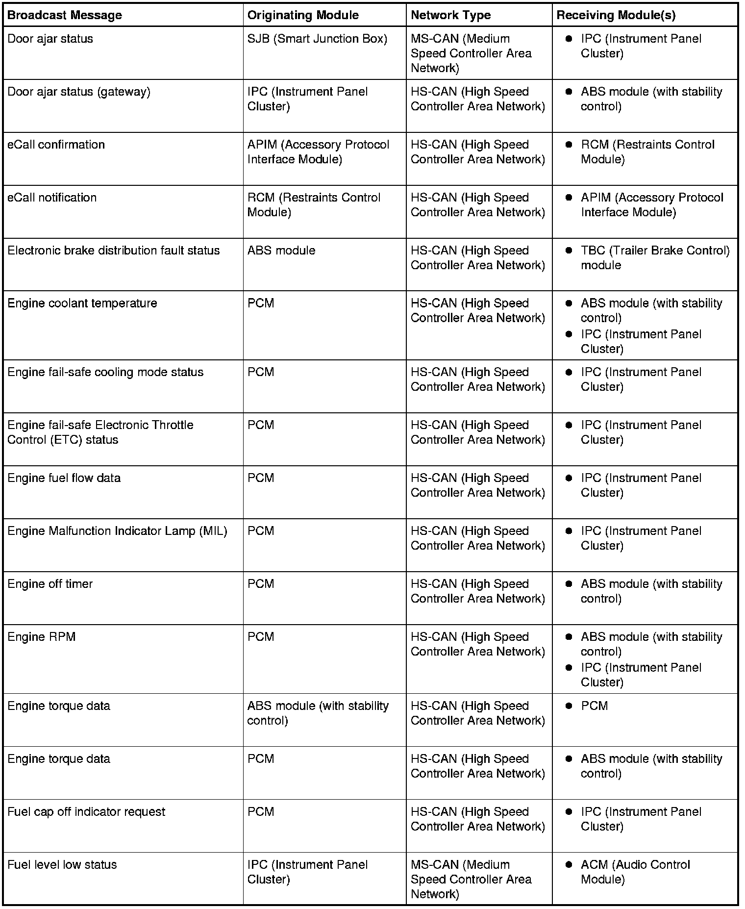 Modules on the CAN (Controller Area Network) utilize simultaneous communication of two or more messages on the same network circuits. The following chart summarizes the messages sent and received on the network.