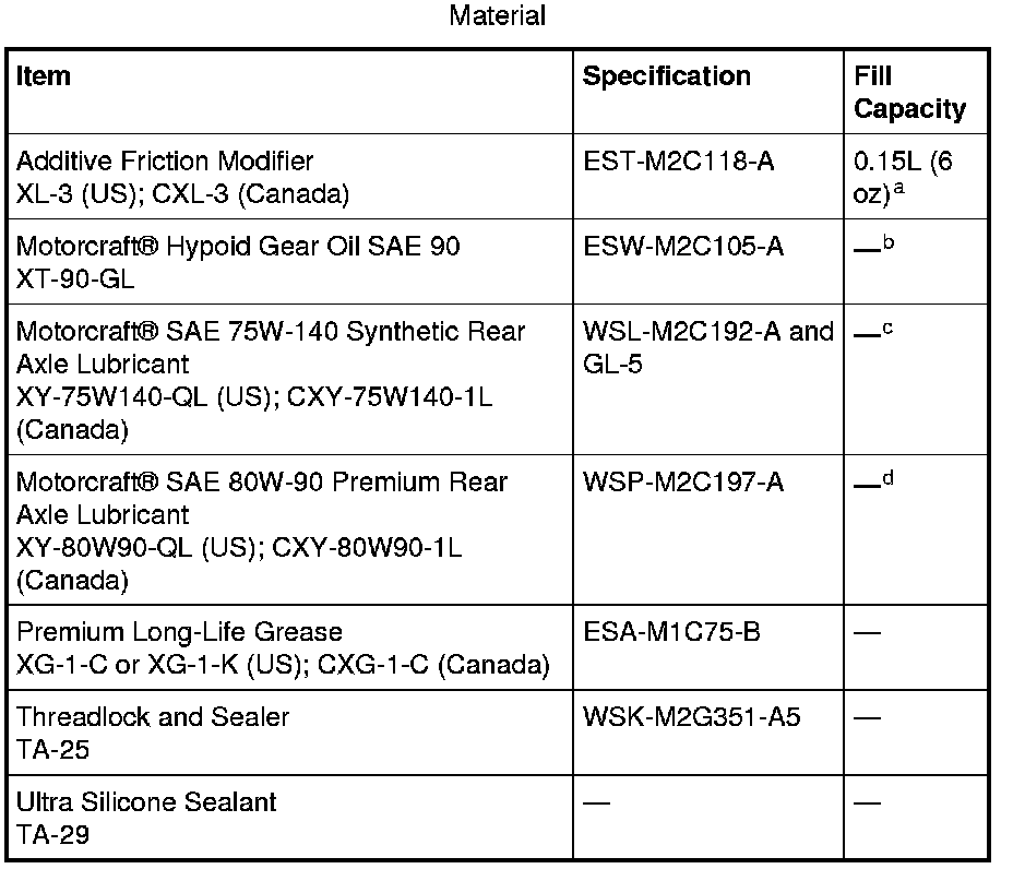 a For a complete refill on Model 60 axles equipped with a limited slip differential, add 0.15L (6 oz) of Additive Friction Modifier XL3 meeting Ford specification EST-M2C118-A to lubricate. Model 70 axles equipped with a limited-slip differential have carbon-fiber clutch discs that do not require any friction modifier.