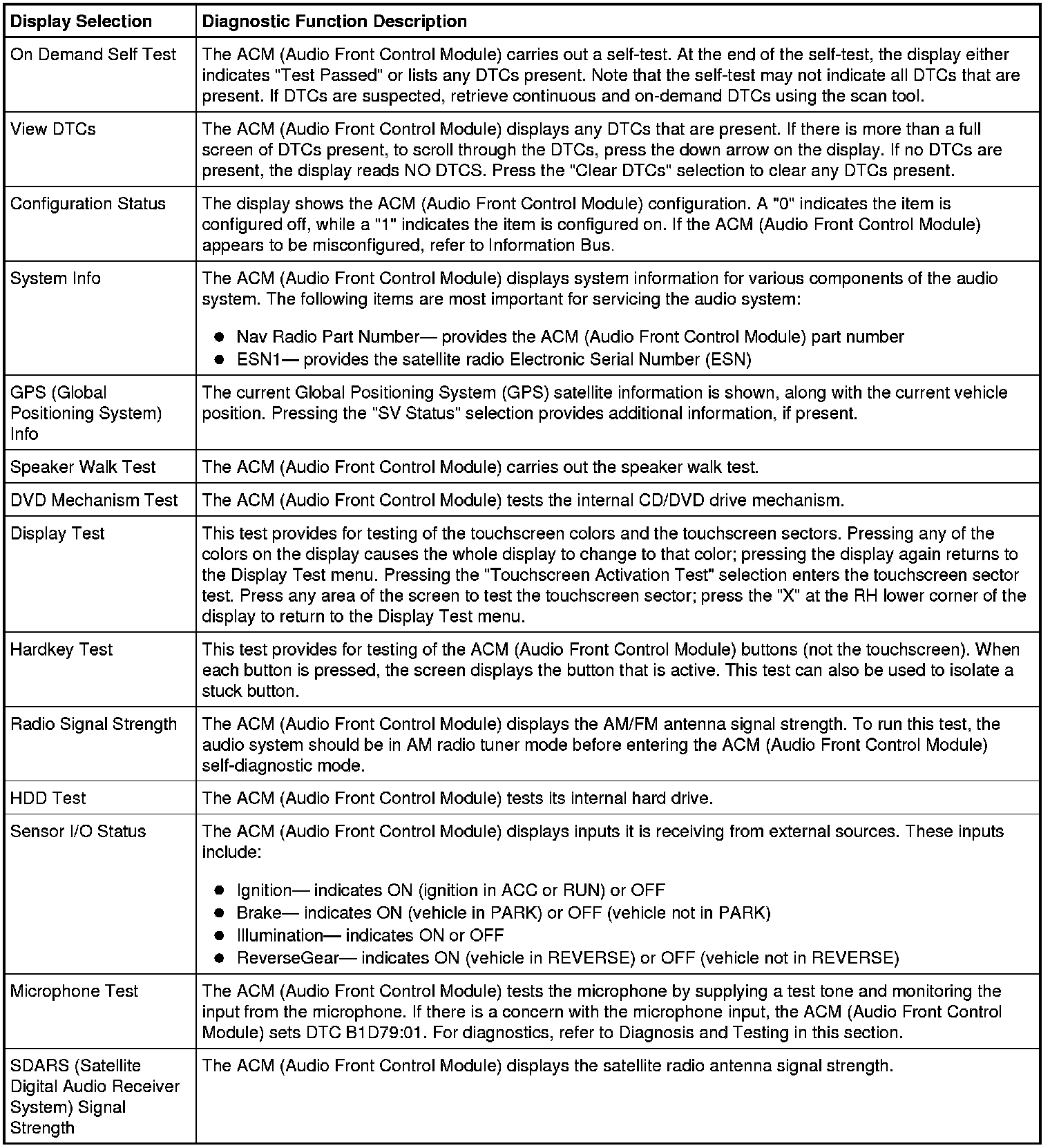5. To exit the self-diagnostic mode, turn the ACM (Audio Front Control Module) off.