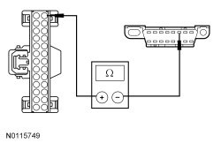 - Measure the resistance between the SCCM (Steering Column Control Module) C2414A-13, circuit GD115 (BK/GY), harness side and ground.