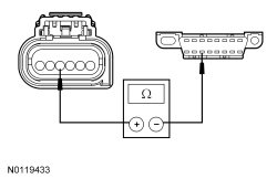 - Measure the resistance between the SOD-R (Side Obstacle Detection Control Module - Right) C4370-3, circuit VDB06 (GY/OG), harness side and the DLC (Data Link Connector) C251-3, circuit VDB06 (GY/OG), harness side.