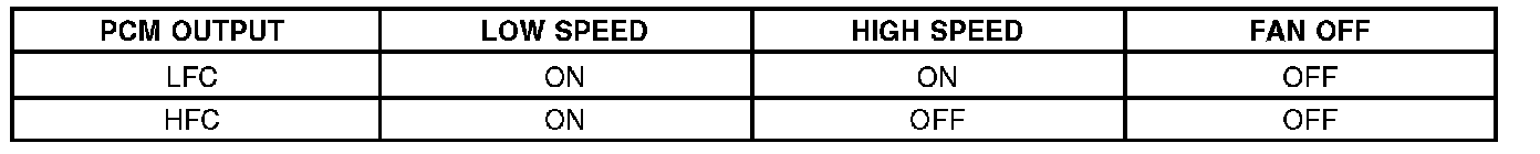 For 2-speed fans, although the PCM output circuits are called low and high fan control, cooling fan speed is controlled by a combination of these outputs. Refer to the following tables.