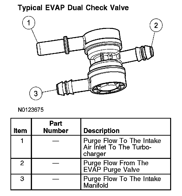 The EVAP dual check valve is used to allow purge flow during boost conditions. Fuel vapors flow through the EVAP dual check valve to the intake air system upstream of the turbocharger before entering the intake manifold. When the engine is OFF, or at atmospheric pressure, the EVAP dual check valve is in an indeterminate state.