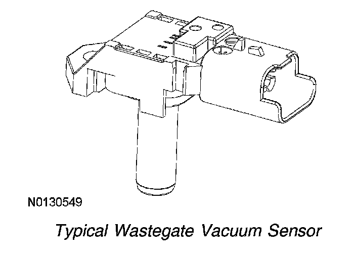 The wastegate vacuum sensor is an absolute pressure sensor that provides the PCM an analog voltage output that is proportional to the applied vacuum. The wastegate vacuum sensor is located near the turbocharger and the turbocharger wastegate regulating valve solenoid. The wastegate vacuum sensor measures the vacuum supplied by the turbocharger wastegate regulating valve solenoid to the wastegate actuator. The PCM uses the information from the wastegate vacuum sensor to determine the amount of vacuum being applied to the wastegate actuator.