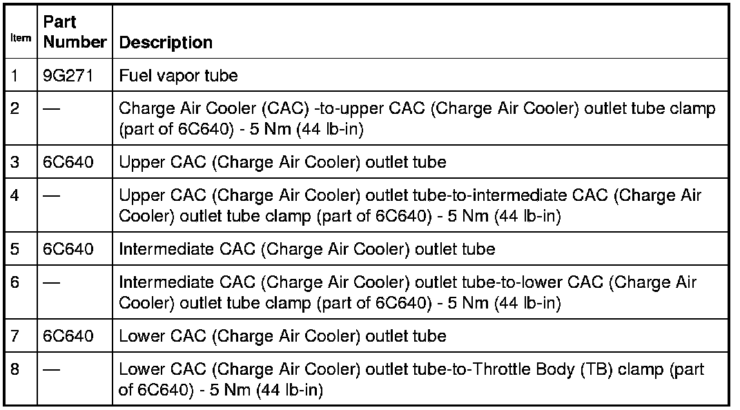NOTE: Securely seal the Charge Air Cooler (CAC) tubes-to-Throttle Body (TB) to prevent unmetered air from entering the engine or pressurized air from escaping.