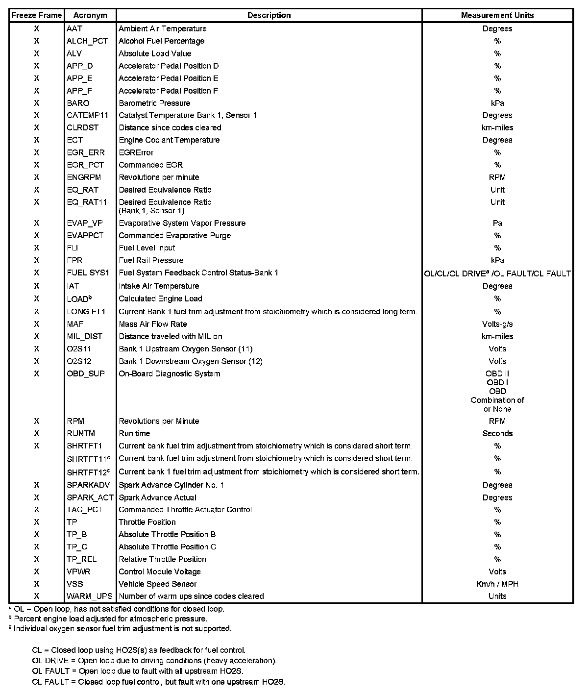 An X in the Freeze Frame column denotes both a mode 1 and mode 2 PID (real time and freeze frame).