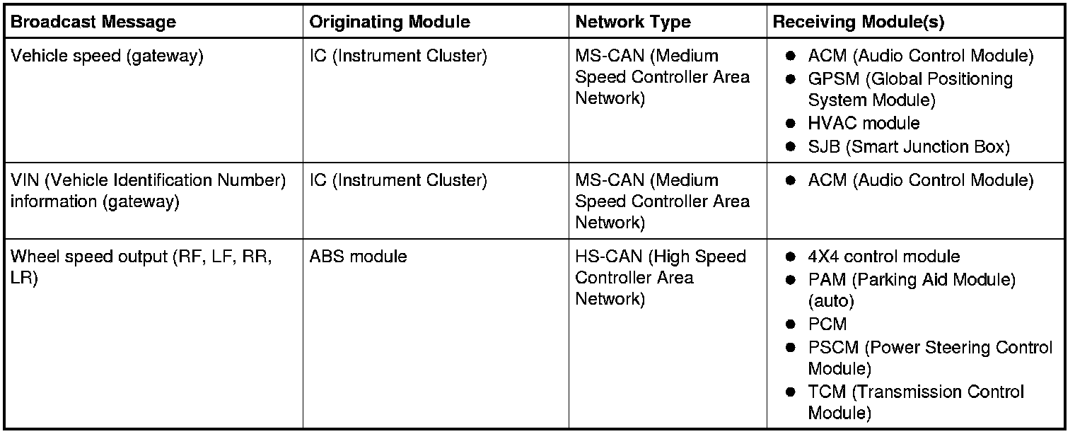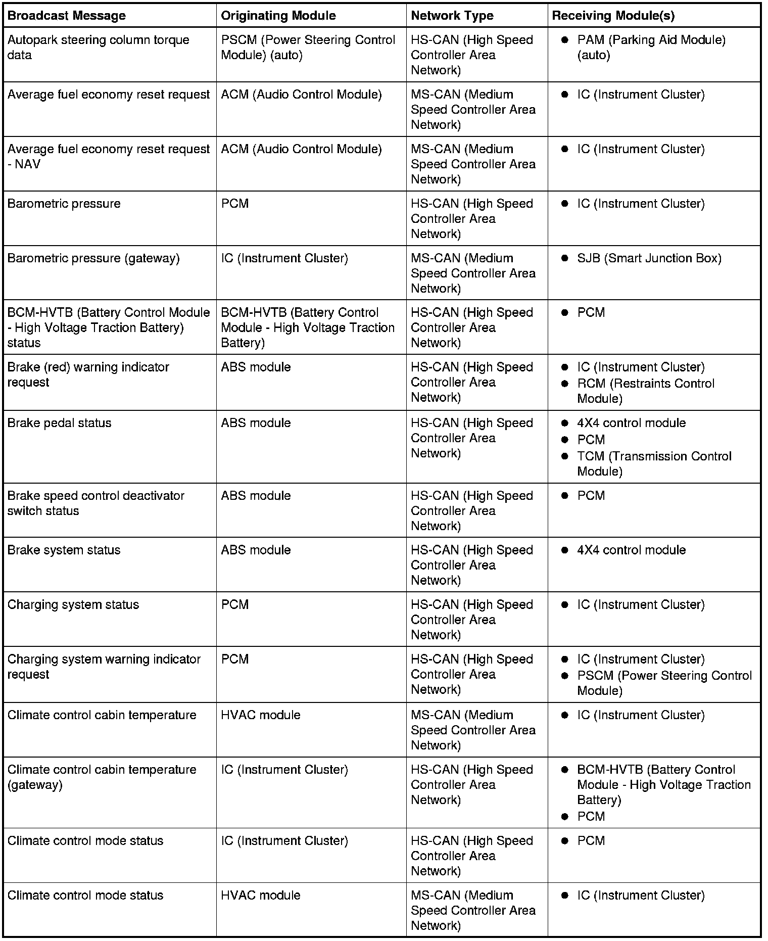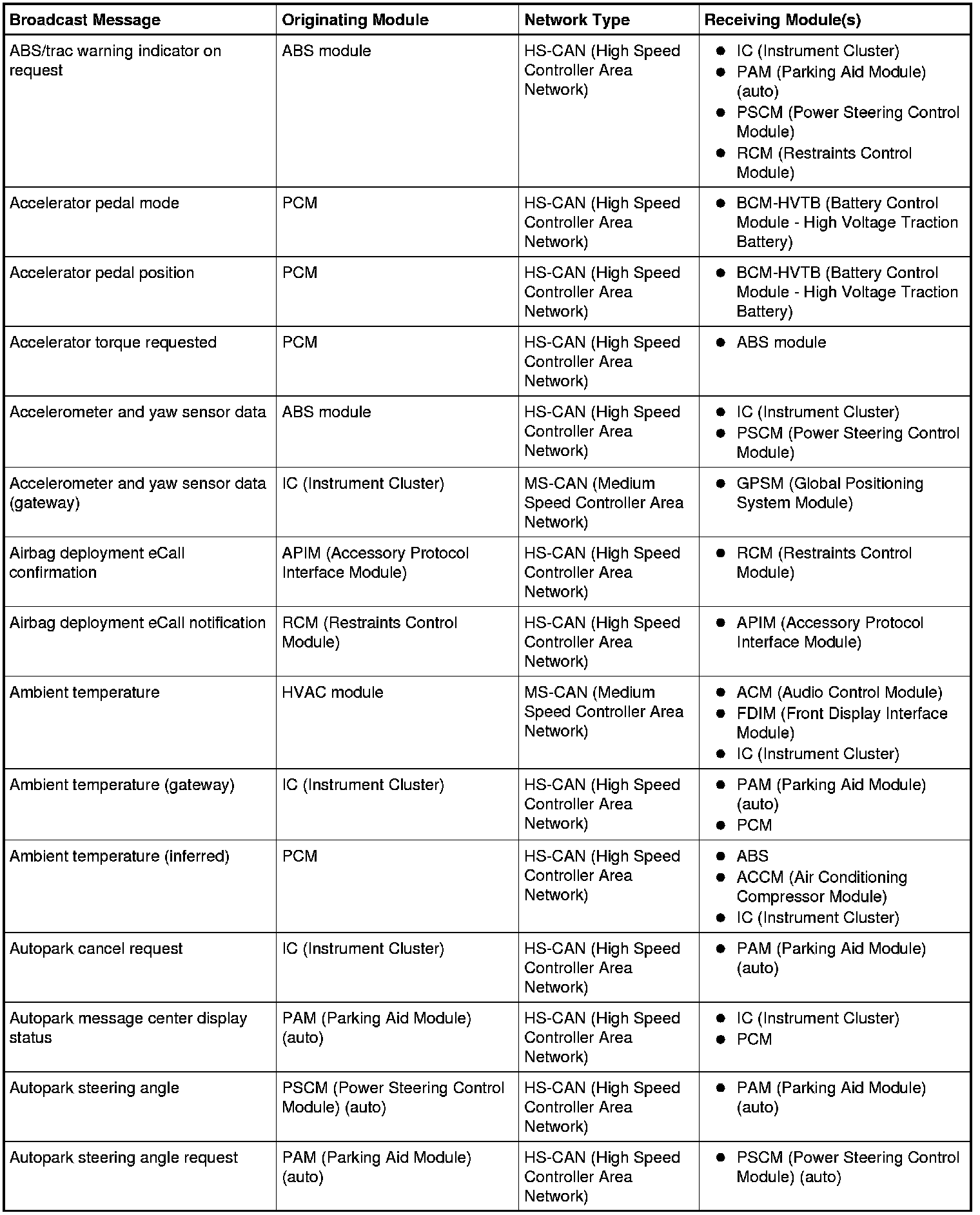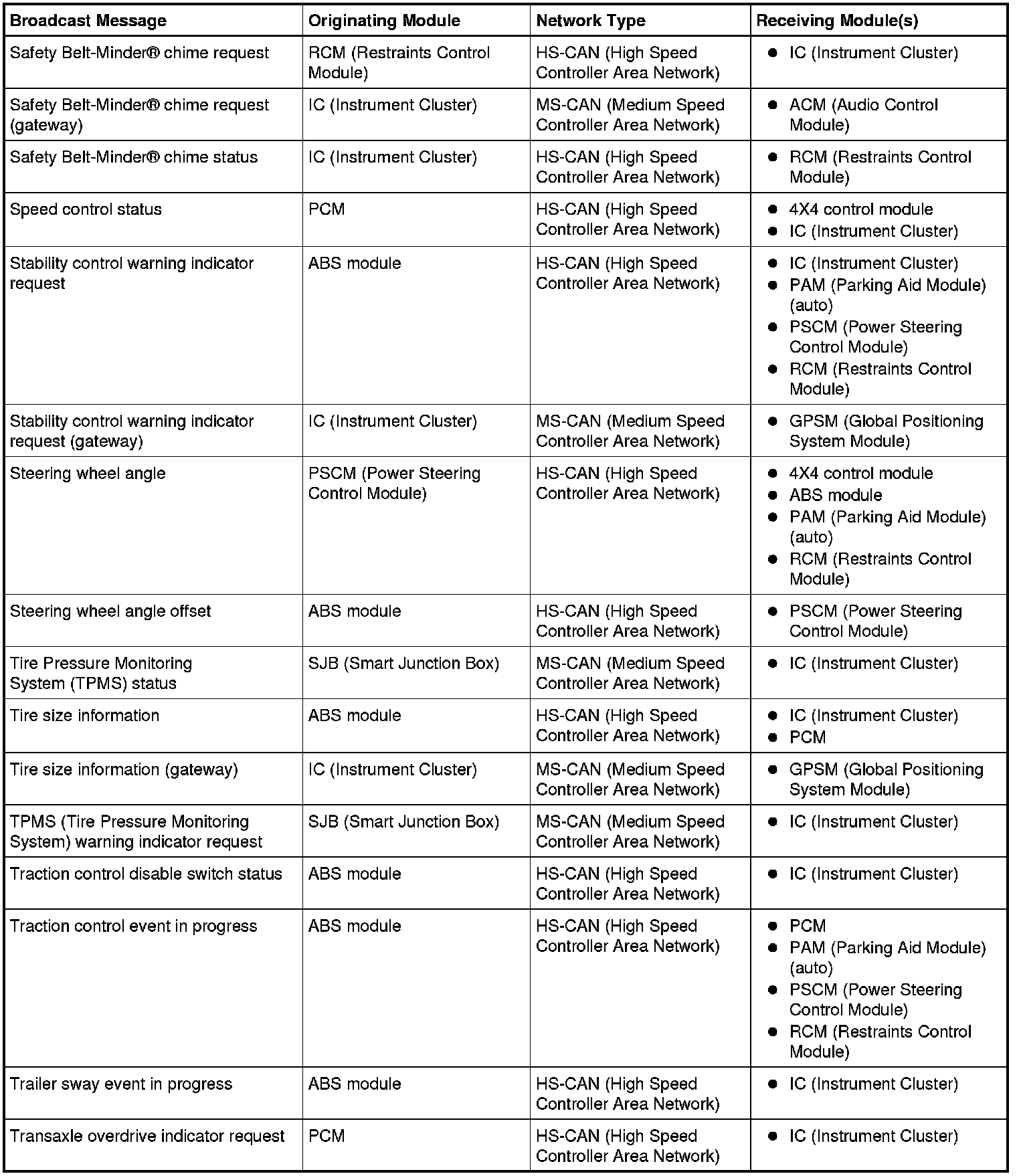 Modules on the CAN (Controller Area Network) utilize simultaneous communication of 2 or more messages on the same network circuits. The following chart summarizes the messages sent and received on the network.