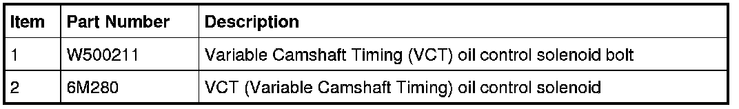 2. Remove the bolt and the Variable Camshaft Timing (VCT) oil control solenoid.