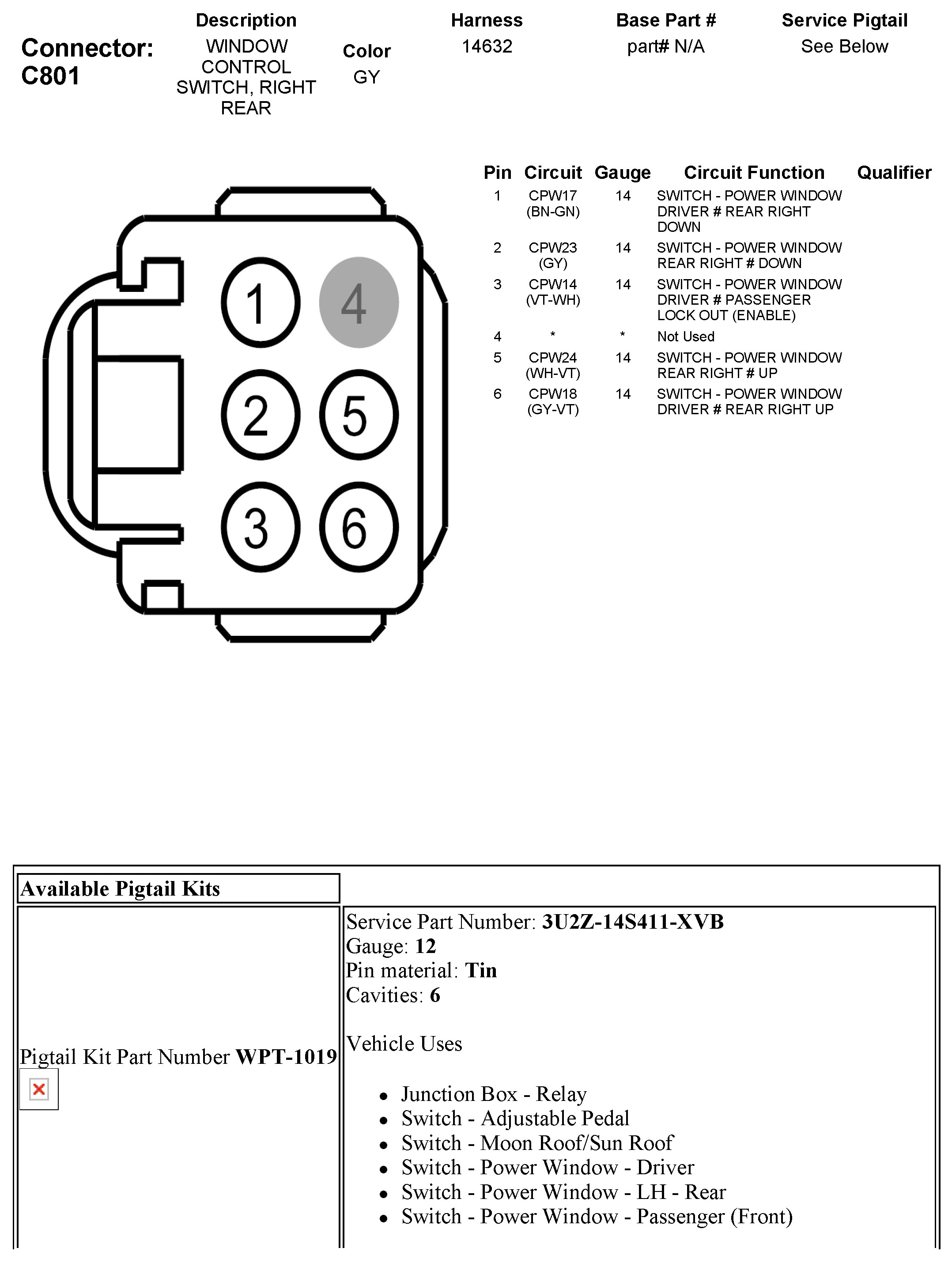 C801 Window Control Switch, Right Rear