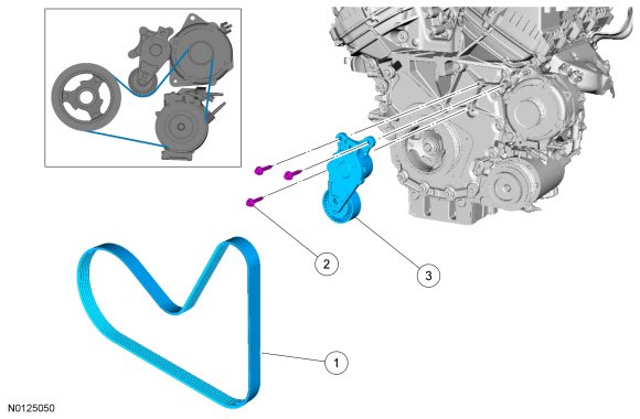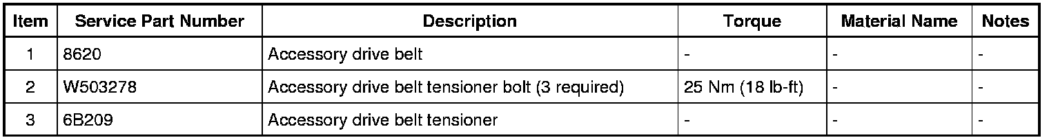 NOTICE: Under no circumstances should the accessory drive belt, tensioner or pulleys be lubricated as potential damage to the belt material and tensioner damping mechanism will occur. Do not apply any fluids or belt dressing to the accessory drive belt or pulleys.