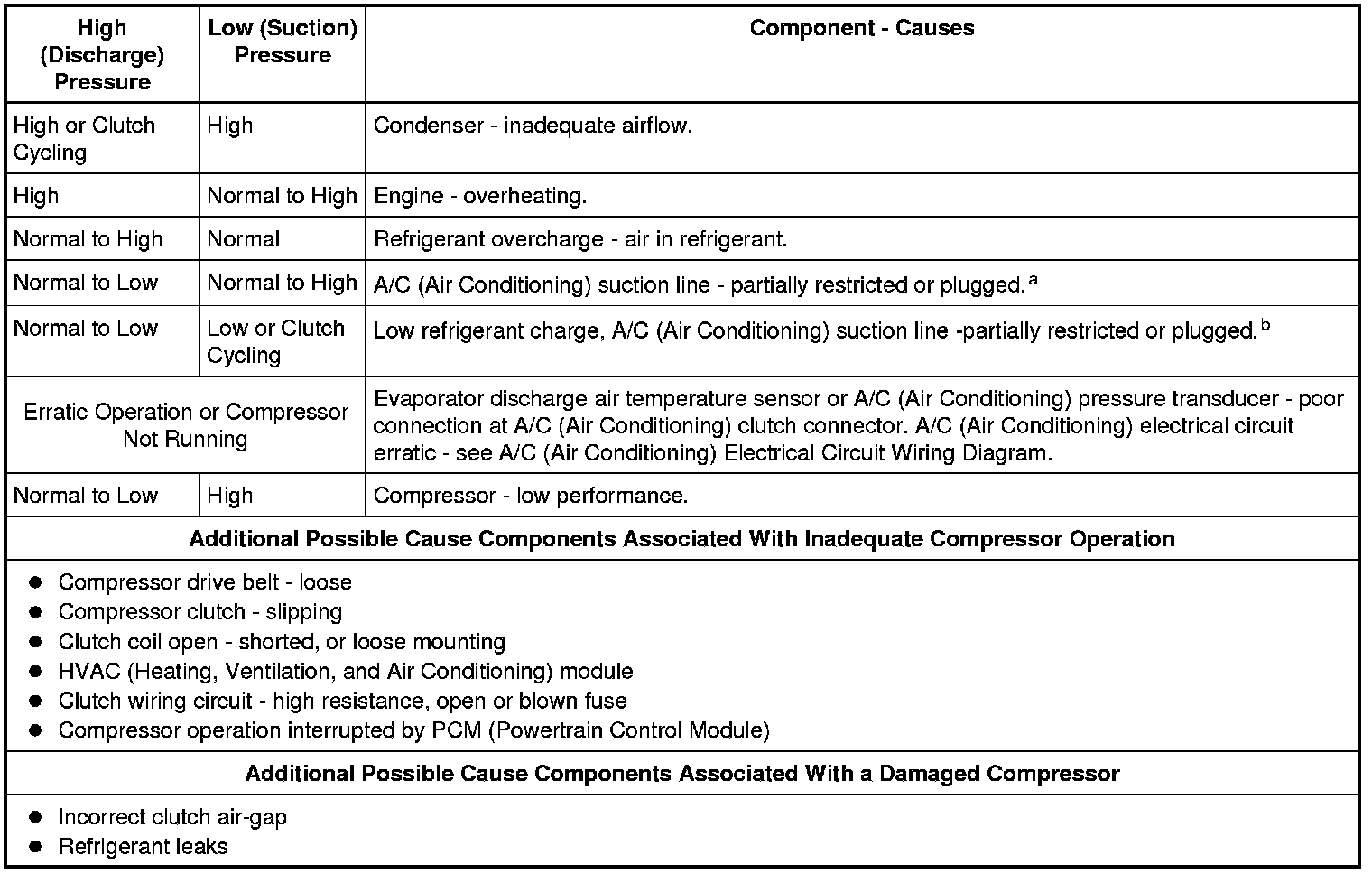 NOTE: The following table is used to guide diagnosis of the refrigerant system if operating pressures are outside normal limits.