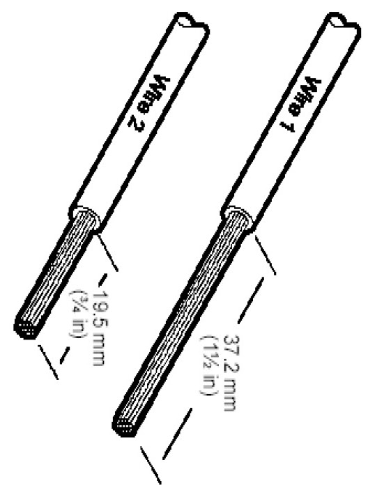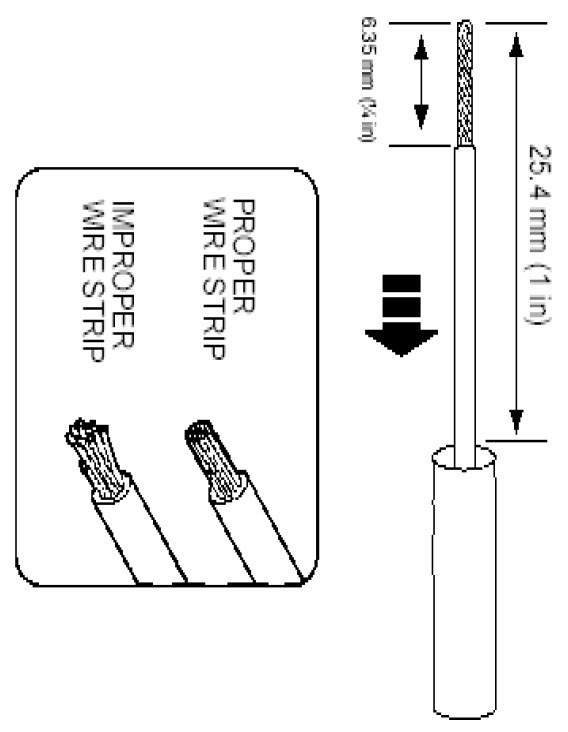 2. Strip 6.35mm (1/4 in) of insulation from each wire end, taking care not to nick or cut wire strands.
