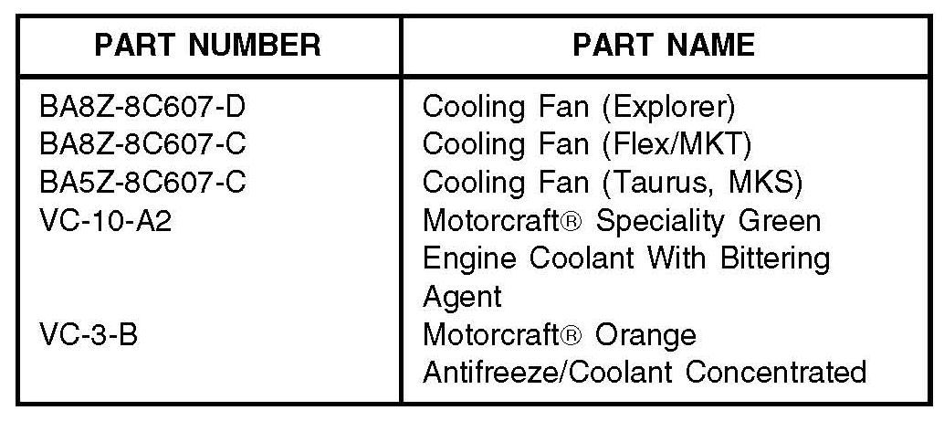 Some 2011 and 2012 Explorer, Taurus, Flex, MKS and MKT vehicles built on or after 9/1/2010 and equipped with dual engine cooling fans may exhibit a lack of air conditioner performance while the vehicle is stationary or moving at slow speeds, and/or an overheat condition. Diagnostic trouble codes P0217, P1299 and P1285 may be present.