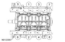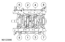 Late built engines, install the new 8 main bearing cap side bolts. Tighten in the sequence shown in 2 stages.