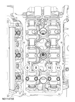 Tighten bolts 8, 9, 10 and 11 to 8 Nm (71 lb-in) then an additional 45 degrees.