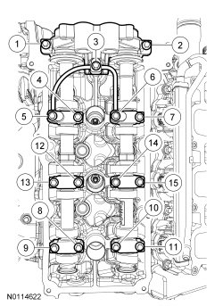Install the 6 camshaft caps, mega cap, valve train oil tube and the 15 bolts in the sequence shown.