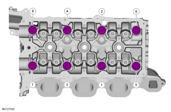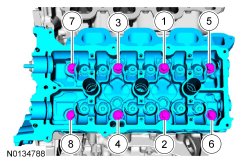 Install a new gasket, the LH (Left Hand) cylinder head and 8 new bolts. Tighten the bolts in the sequence shown below in 5 stages:
