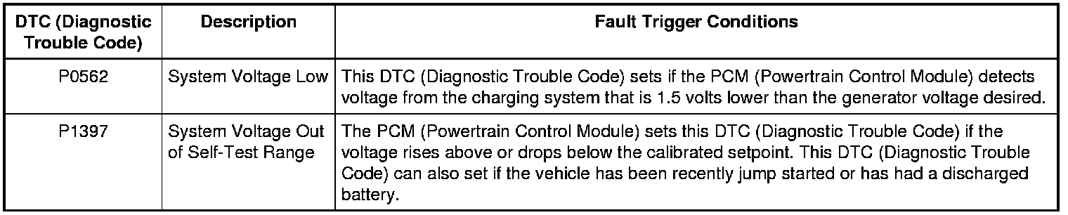 With the engine running, the charging system supplies voltage to the battery and the electrical system through the high current BJB (Battery Junction Box) and battery B+ cable. The PCM (Powertrain Control Module) monitors this voltage. If voltage drops 1.5 volts or more below the generator voltage desired, these DTCs (Diagnostic Trouble Codes) can set after 30 seconds.