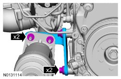 NOTICE: Do not loosen or remove the crankshaft pulley bolt without first installing the special tools as instructed in this procedure. The crankshaft pulley and the crankshaft timing sprocket are not keyed to the crankshaft. The crankshaft, the crankshaft sprocket and the pulley are fitted together by friction, using diamond washers between the flange faces on each part. For that reason, the crankshaft sprocket is also unfastened if the pulley bolt is loosened. Before any repair requiring loosening or removal of the crankshaft pulley bolt, the crankshaft and camshafts must be locked in place by the special service tools, otherwise severe engine damage can occur.