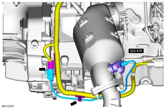 Detach and disconnect the CMS (Catalyst Monitor Sensor) electrical connector and the CMS (Catalyst Monitor Sensor) wiring harness retainer. Using the 303-476 (T94P-9472-A) , remove the CMS (Catalyst Monitor Sensor).