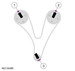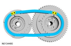Install the primary timing chain with the colored links aligned with the timing marks on the VCT (Variable Camshaft Timing) assemblies and the crankshaft sprocket.