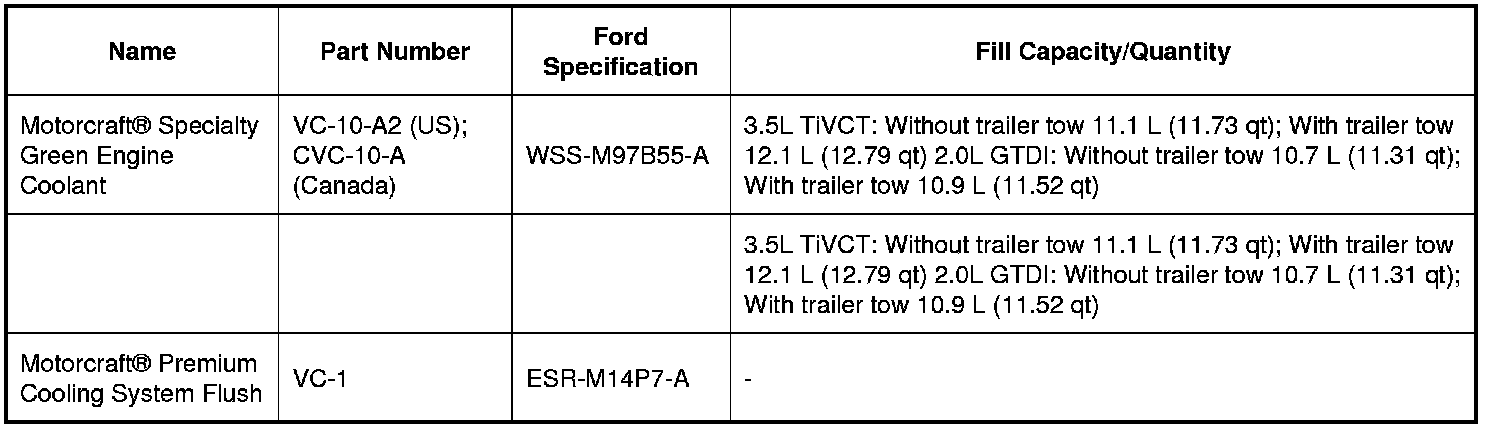 NOTICE: The cooling system is filled with Motorcraft(R) Specialty Green Engine Coolant or. Always fill the cooling system with the manufacturer's specified coolant. If a non-specified coolant has been used the cooling system must be chemically flushed. REFER to Cooling System Flushing . Failure to follow these instructions may damage the engine or cooling system.