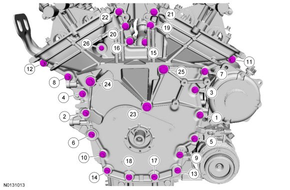 Stage 5: Tighten bolts 23 thru 25 to 30 Nm (22 lb-ft) plus an additional 90 degrees.