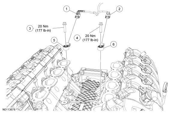 NOTE: Position the VCT (Variable Camshaft Timing) variable force solenoid and tighten the bolts in 2 stages.