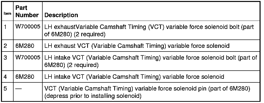 NOTICE: The Variable Camshaft Timing (VCT) variable force solenoid pins must be fully depressed to avoid interference with the VCT (Variable Camshaft Timing) valve tips when installing the solenoids. Failure to follow these instructions can result in damage to the engine.