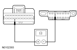 - Measure the resistance between the ILCM (Interior Lighting Control Module) C3498-17, circuit VDB06 (GY/OG), harness side and the Data Link Connector (DLC) C251-3, circuit VDB06 (GY/OG), harness side.