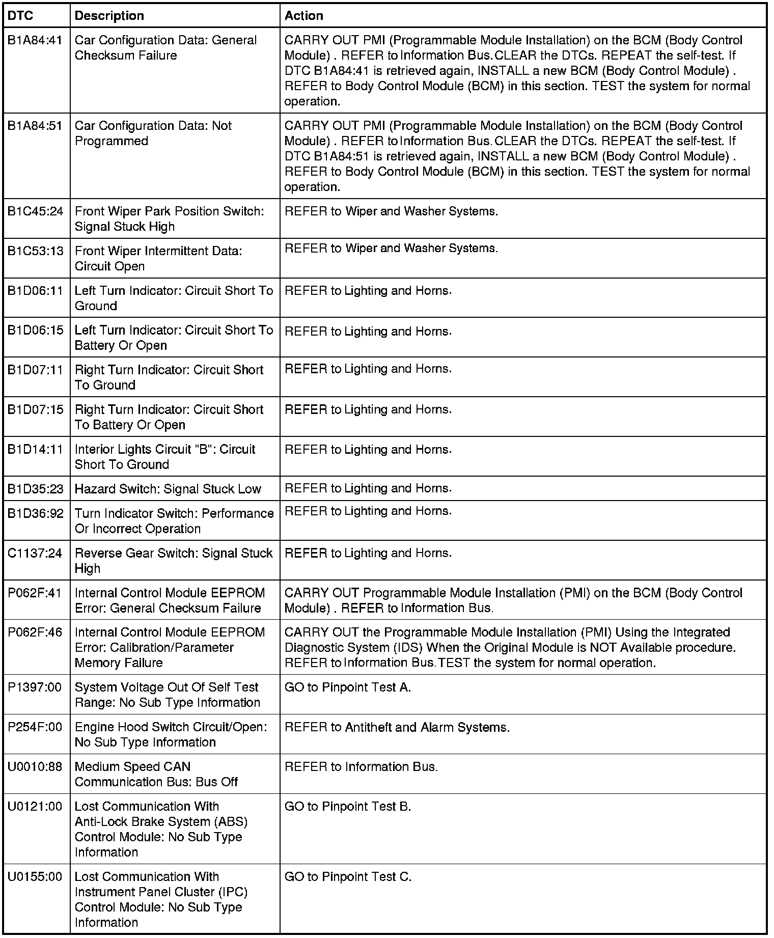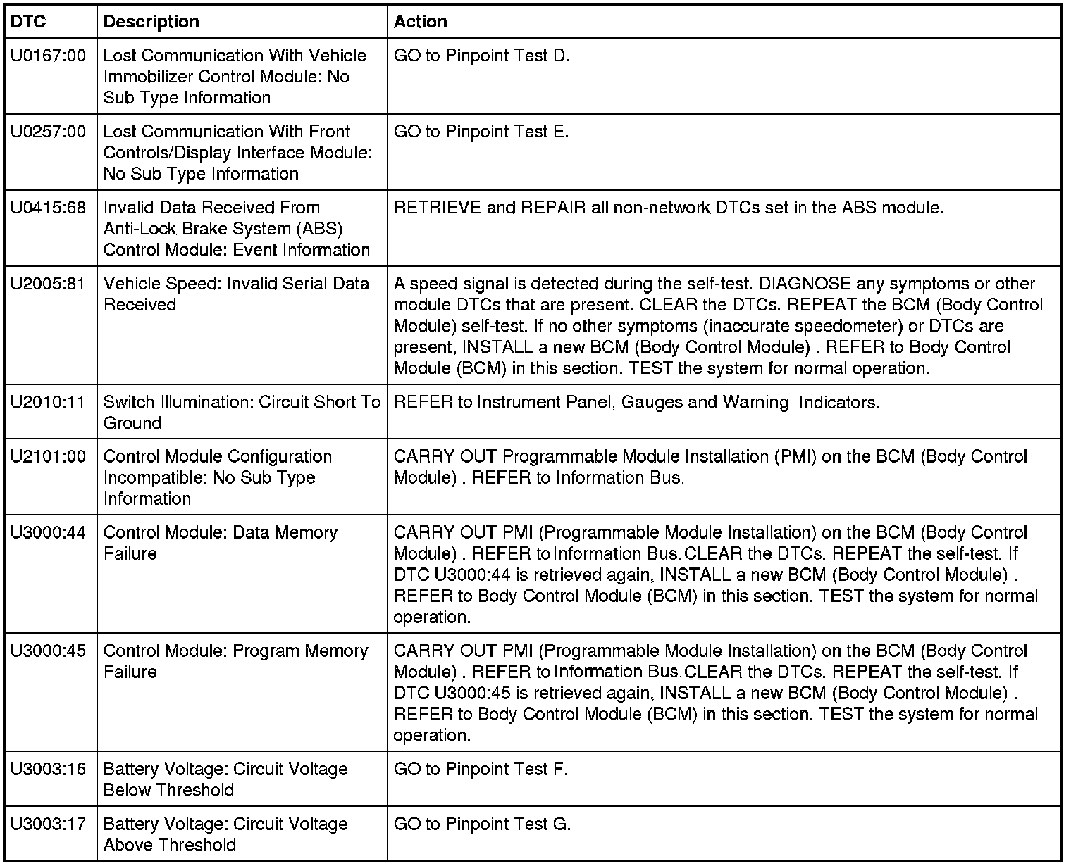 Body Control Module (BCM) DTC Chart