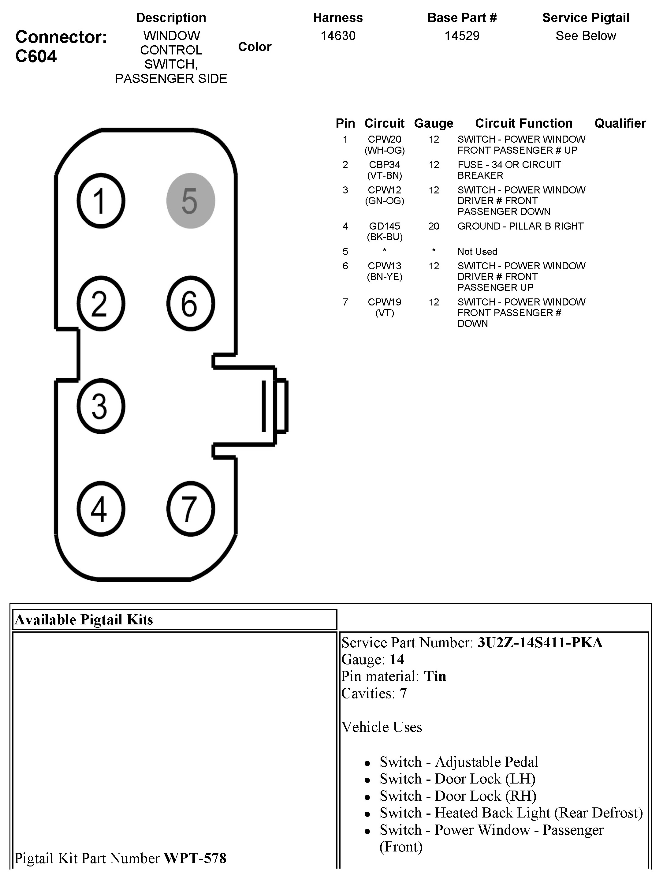 C604 Window Control Switch, Passenger Side